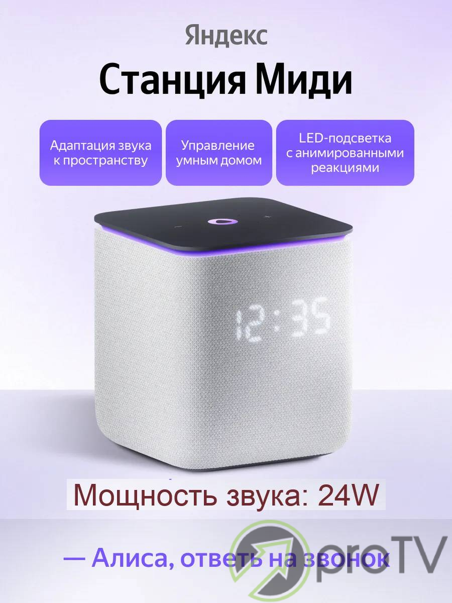 Среднеразмерная умная колонка с Алисой, не такая крупная как Станция 3 или Макс, но с куда более серьёзным звуком чем Мини 3. Станция Миди впишется в любое пространство вашего дома. 4 микрофона воспринимают ваши команды даже в большом и шумном помещении, даже если говорите тихо. Благодаря переходу на нейронный процессор Станция Миди быстрее обрабатывает ваши запросы. А значит, Алиса лучше откликается на команды и точнее узнаёт людей по голосу. Имеется LED-дисплей, который показывает время, погоду и реакции Алисы, а также активная контурная LED-подсветка. Встроенный хаб управления Zigbee и голосовое управление умным домом даже без интернета. Мощный и сочный звук 24 Вт с выраженными басами. Обратите внимание: Алиса понимает и общается только на русском языке!